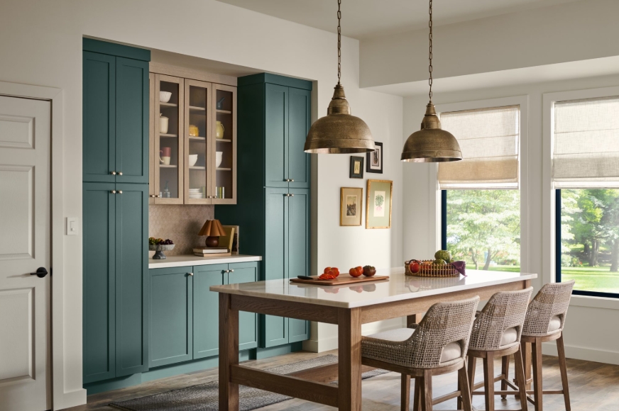 Walls remain neutral, while Color of the Year shades appear through styling, art, and accessories — creating continuity without distraction.